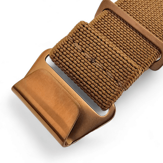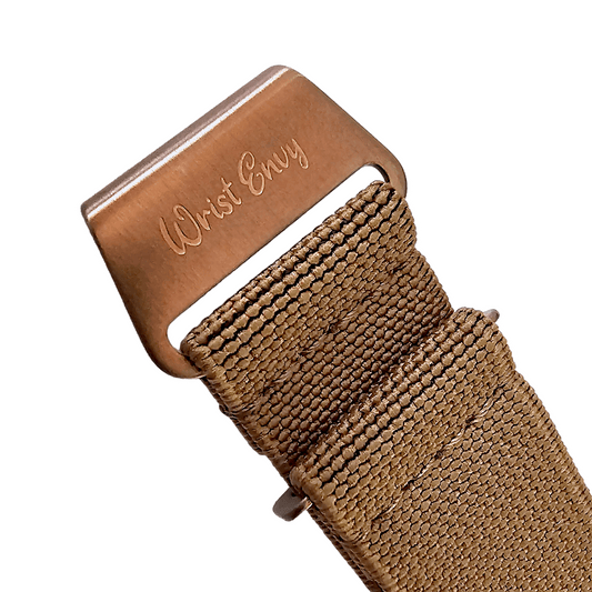 Combining stainless steel durability and a casual, rugged design, bronze buckle NATO straps are an excellent choice for adventurous spirits. These straps are lightweight and comfortable, making them ideal for outdoor activities or everyday wear. Their military-inspired hardware style pairs seamlessly with casual outfits while still holding their own in more polished settings.Explore NATO watch straps to find a strap that matches your style.
