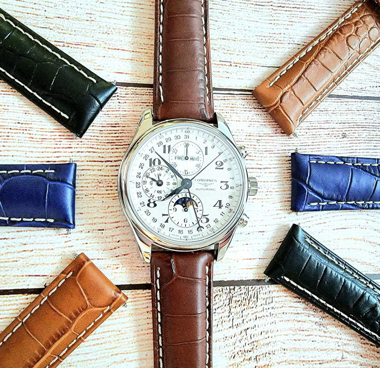 Crocodile leather watch straps, available in genuine leather or calf leather with a crocodile or alligator grain pattern. Our straps come in popular sizes like 20mm and 22mm and a variety of colors.