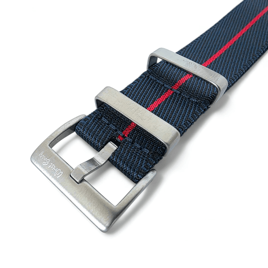 NATO watch straps were created for the British Ministry of Defence the NATO straps one piece nylon design ensured a secure fit in harsh military environments whilst offering a lightweight solution. Its wrap around style added extra protection—if a spring bar failed the watch would stay attached. Over time NATO straps gained popularity outside the military due to their rugged durability, comfort and low maintenance style. A NATO strap is now one of the most versatile and sought after watch bands worldwide celebrated for military heritage, practicality and style.