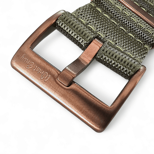 Premium nylon NATO watch straps designed and created by Wrist Envy inspired by British military single pass wrap around bands with silver, Bronze and black hardware colour options.