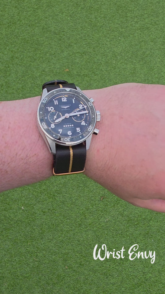 At Wrist Envy we specialise in making premium NATO watch straps UK customers love for style, comfort and durability. Our NATO watch strap collection features a wide range of NATO straps for watches inspired by the classic British military design. Whether you want a rugged military watch strap for outdoor use, a stylish everyday upgrade or the iconic NATO strap James Bond made famous—think Bond in a tuxedo, ordering a Vesper Martini—our collection has something for everyone. Our NATO watch bands use high quality materials like durable woven nylon, supple leather that develops character as worn and premium hardware including buckle and keepers. Our NATO watch straps are available in 18mm, 20mm and 22mm finding the right NATO strap for your watch is easy.