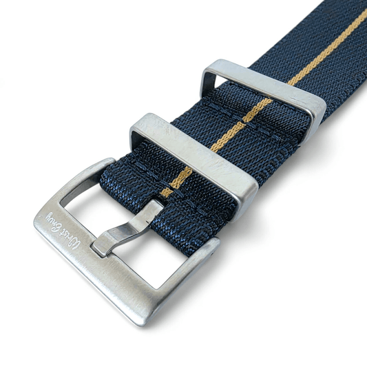 NATO Watch Straps: Originally designed for military use, NATO watch straps are incredibly popular for their durability, security, and ease of use. These straps have a distinctive wrap-around style that threads through both spring bars, keeping your watch secure even if one of the spring bars breaks. Available in a variety of colors and materials, our NATO straps provide a blend of reliability and style that makes them perfect for field, dive, and everyday watches.