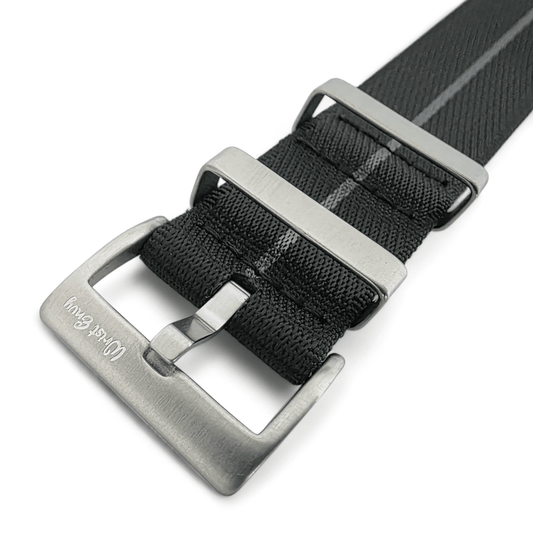 NATO watch straps were created for the British Ministry of Defence the NATO straps one piece nylon design ensured a secure fit in harsh military environments whilst offering a lightweight solution as well as water resistance. Its wrap around style added extra protection—if a spring bar failed the watch would stay attached. Over time NATO straps gained popularity outside the military due to their rugged durability, comfort and low maintenance style. A NATO strap is now one of the most versatile and sought after watch bands worldwide celebrated for military heritage, practicality and style.