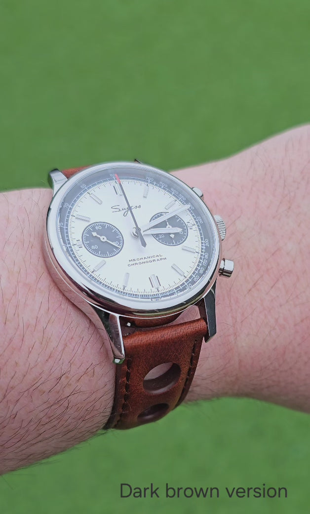 This rally strap was originally bought to pair with a Christopher Ward C60 Trident Pro 600 which works well. The leather is good quality and has a supple feel with a signed stainless steel buckle and looks the business when paired with a Bulova Lunar Pilot 43mm with lunar texture face and navy blue dials. A perfect match imo!