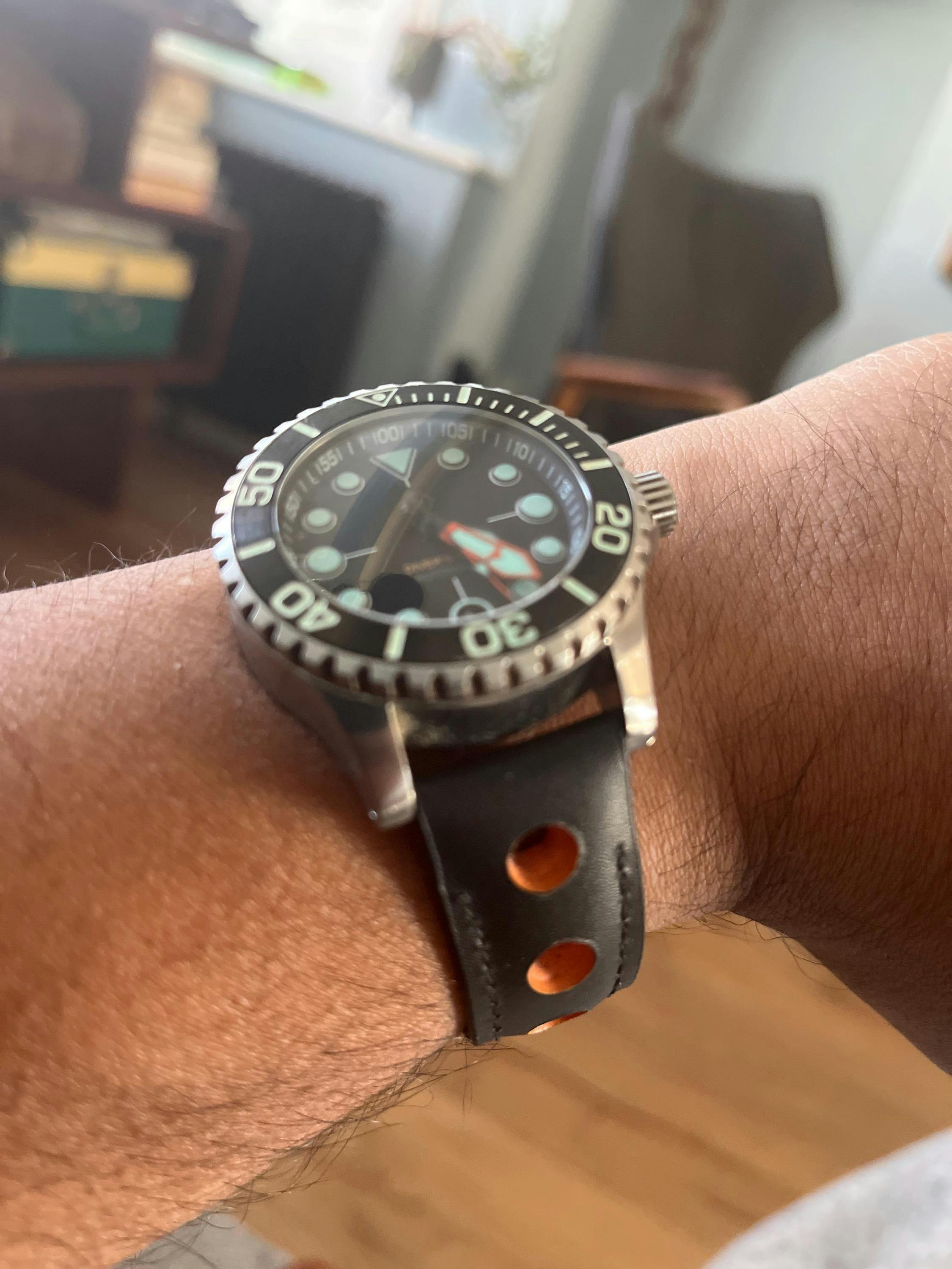 Padded Leather rally watch strap with Contrast Orange Stitching. Made from Premium Calfskin Leather. Available in 20mm, 22mm and 24mm.